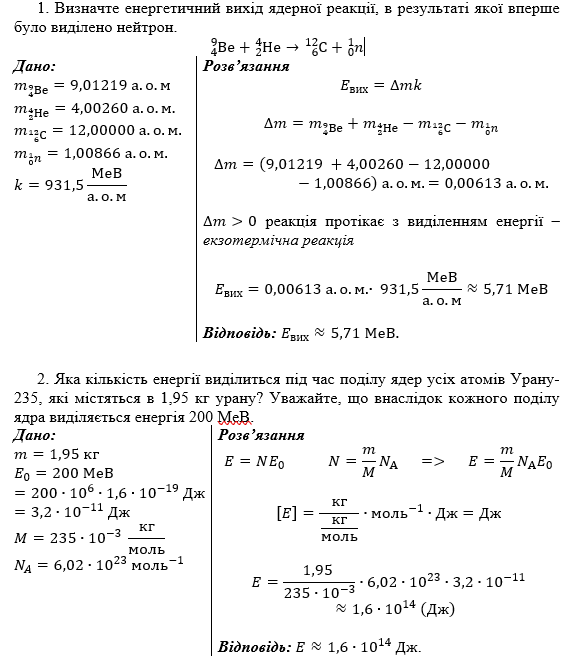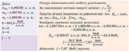 Аналіз фізичної проблеми. У ядрі Гелію 42Не 2 протони (Ζ = 2) і 4 нуклони (А = 4). Використавши числові значення мас атома Гідрогену, нейтрона та атома Гелію, одержимо дефект мас в атомних одиницях маси та знайдемо питому енергію зв’язку.