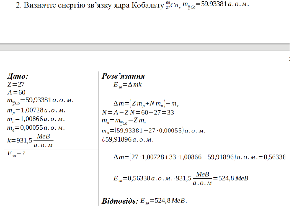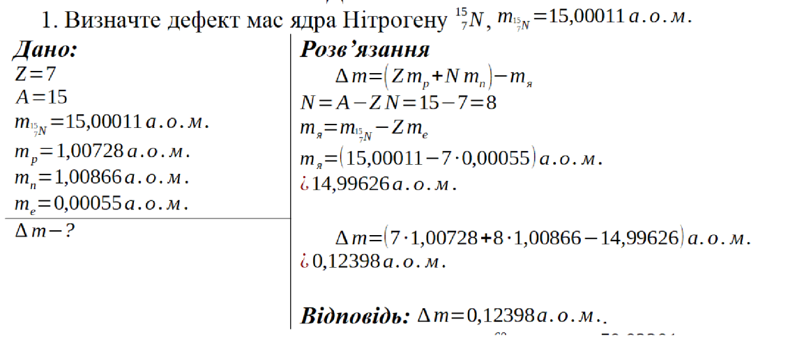 Задача. Обчисліть питому енергію зв’язку ядра Гелію (42Не). Необхідні дані знайдіть у таблиці «Маса деяких нуклідів» (Додаток 1).