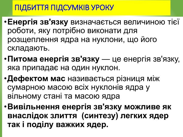 • Маса ядра атома є меншою, ніж сума мас нуклонів у його складі. Зазначену різницю називають дефектом мас Am. Дефект мас визначає енергію зв’язку: Езв = Δmс2.