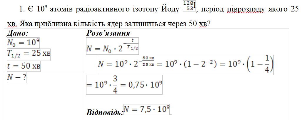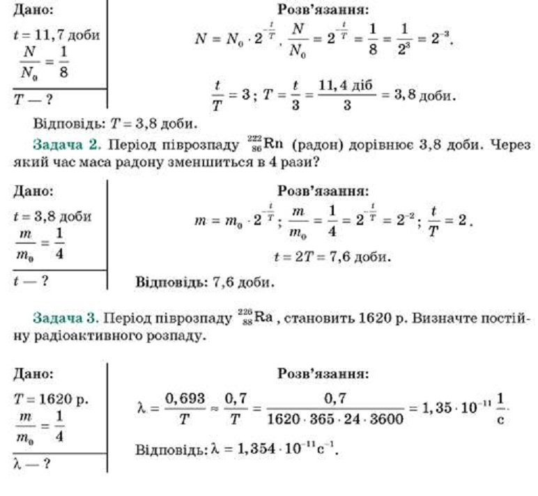 Задача 1. Кількість атомів радіоактивного радону зменшилася у 8 разів за 11,4 доби. Визначте період піврозпаду радону.